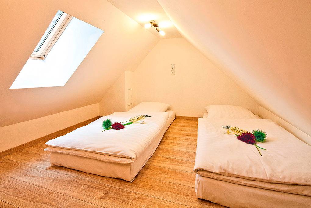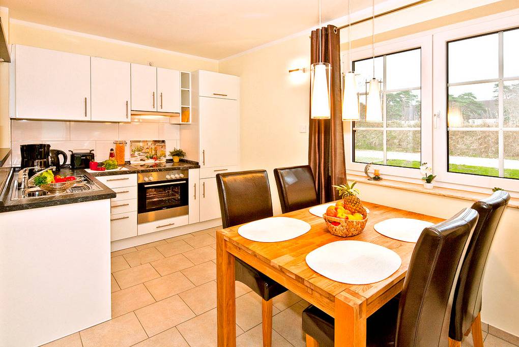 D 28.36 Ferienhaus 2-6 Pers.: Komfortables 3-Zimmer-Ferienhaushälfte mit 69 qm Wohnfläche über 3 Etagen (Nichtraucherhaus). Parterre: Heller, freundlicher Wohn-/Essraum mit Kaminofen, Couchgarnitur, Sat-TV, Esstisch, moderner Einbauküche (Backofen, Spülmaschine). Bad/WC. 1. Etage Doppelzimmer. 2-Bettzimmer. Bad/WC. Vom 2-Bettzimmer Treppe in den offenen Spitzboden (max. Stehhöhe 1,85 m): 2 Einzelbetten (empfohlen für Kinder bis 14 Jahre).