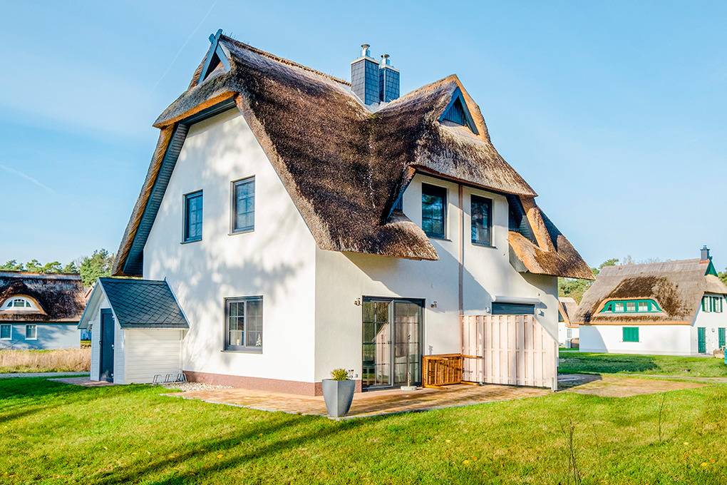 Haus: Großzügig angelegte Ferienhausanlage auf großem gepflegtem Areal (10 ha) mit lichtem Baumbestand. In unmittelbarer Nähe zum Hochufer gelegene hochwertige, reetgedeckte Ferienhaushälfte mit 2 separaten Schlafzimmer, 2 Bädern. Gehobene Ausstattung mit geschmackvoller Möblierung. Zentralheizung. Terrasse mit Sitzmöbeln, Grill. Kostenloser Internetzugang über W-Lan. 1 Pkw-Stellplatz.