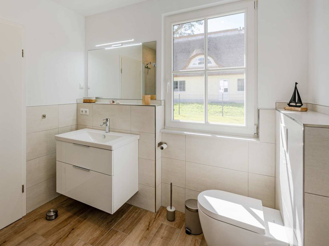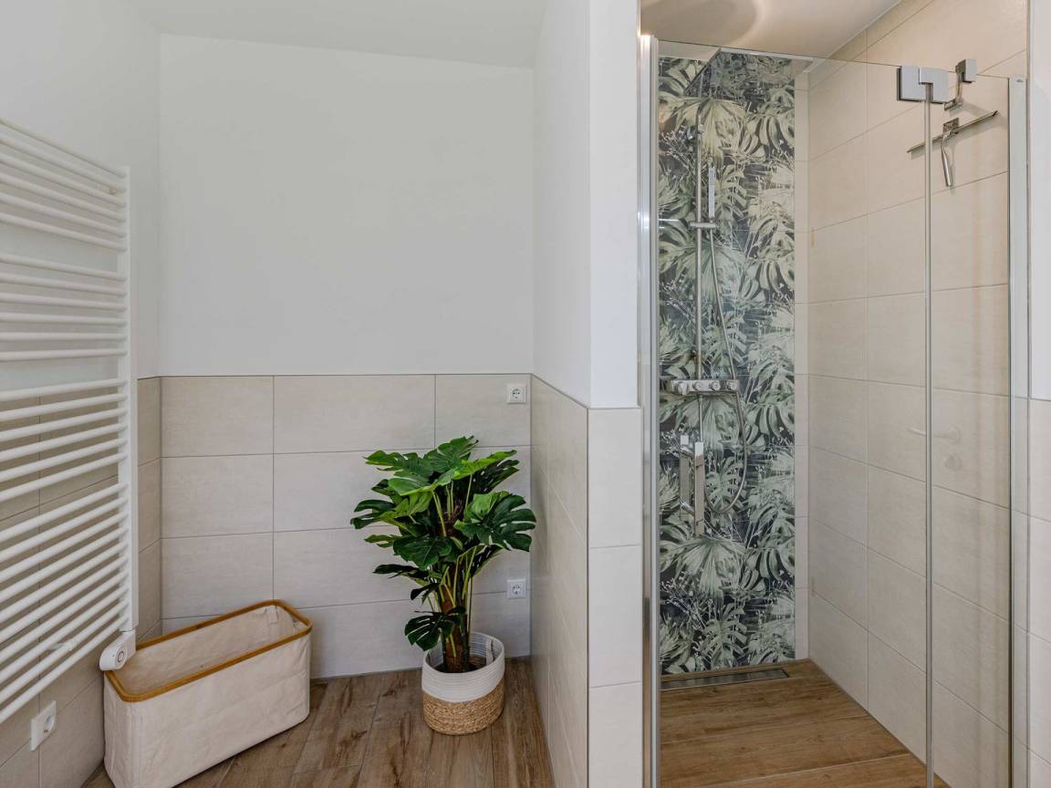 Das letzte Zimmer im Erdgeschoss ist ein helles Tageslichtbad, mit bodengleicher Regendusche, Handtuchtrockner, Waschbecken und WC.