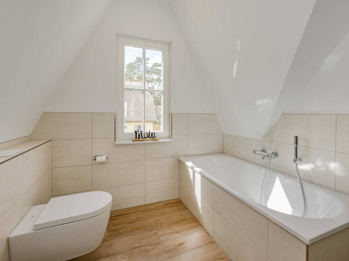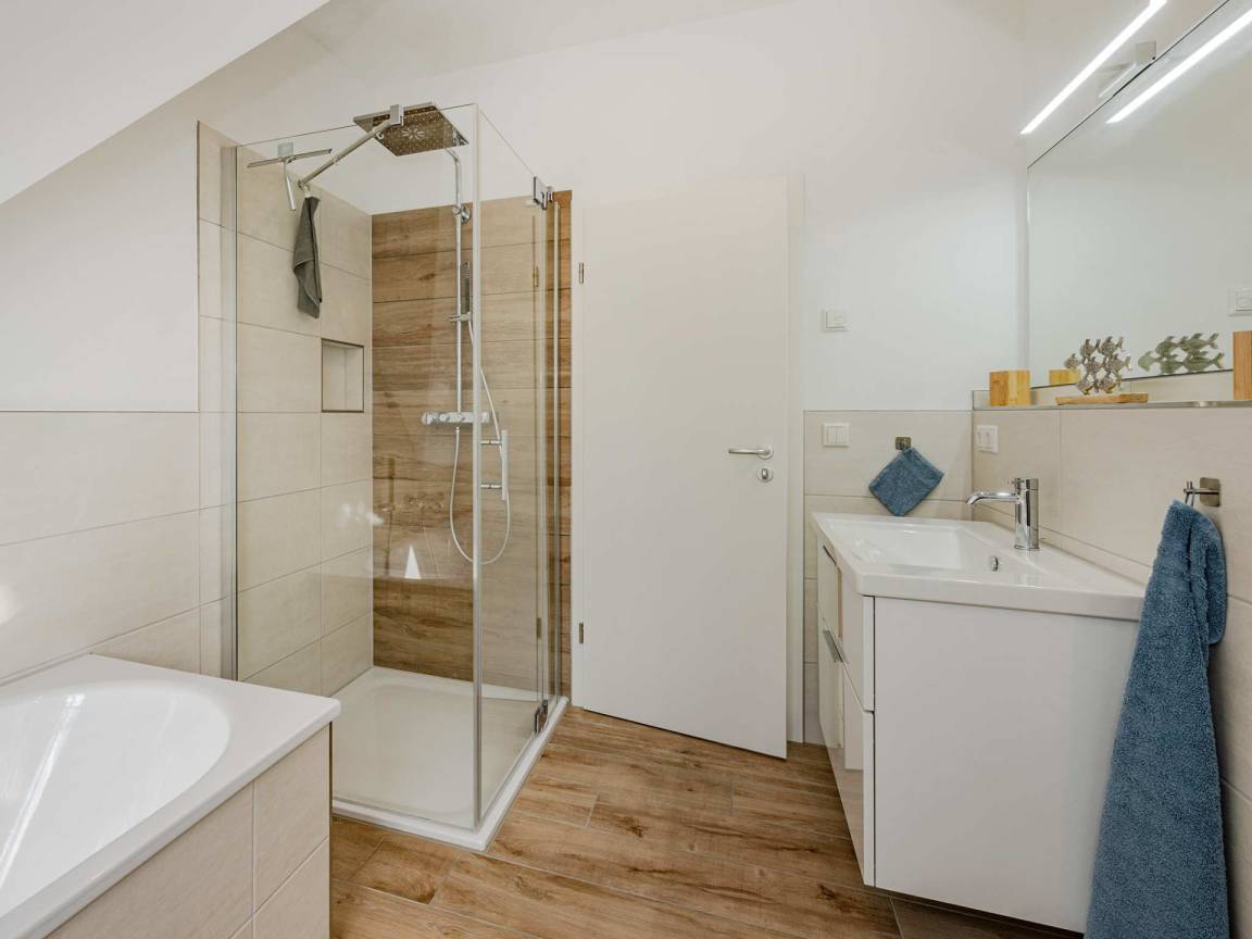 Zudem erwartet Sie ein zweites Tageslichtbad, mit Badewanne, Regendusche und großem Waschbecken im Obergeschoss.