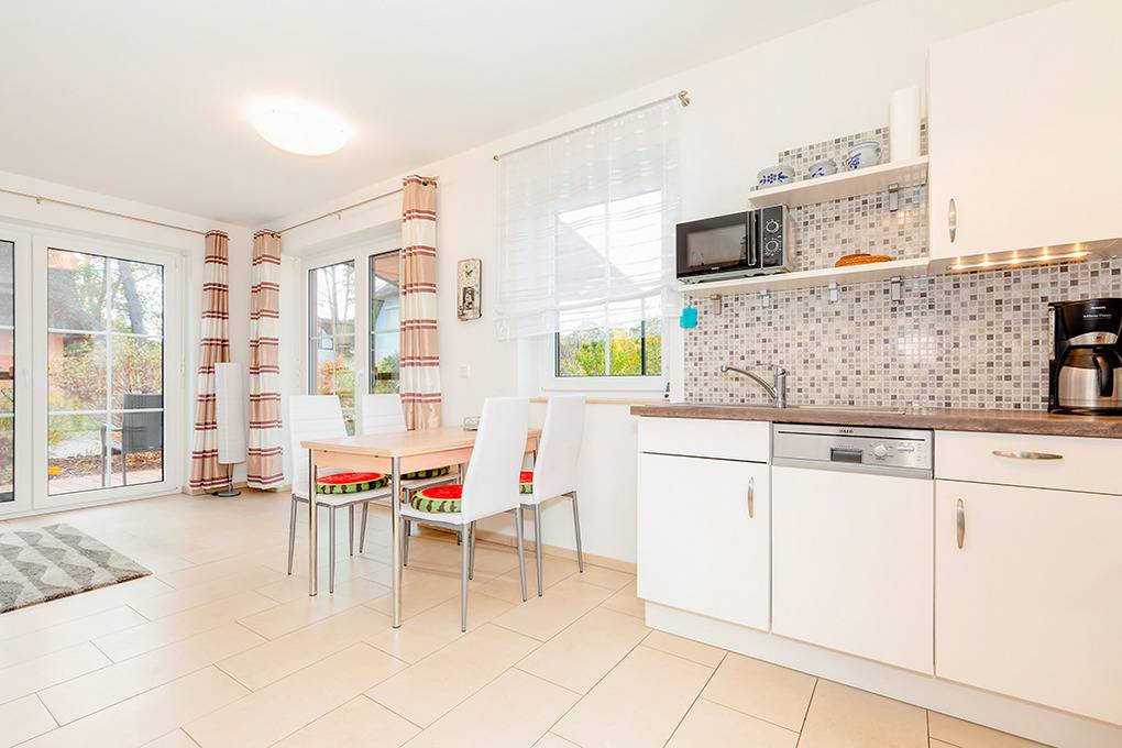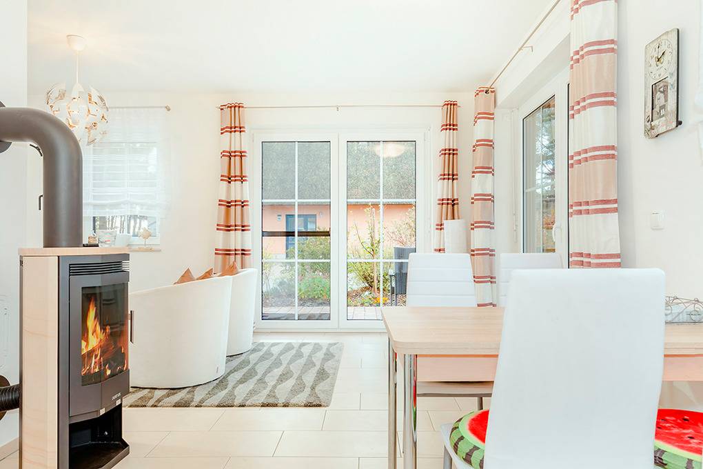 D 28.38 Ferienhaus 3-5 Pers.: Komfortables 4-Zimmerhaus mit 72 qm Wohnfläche über 2 Etagen (Nichtraucherhaus). Parterre: Heller, freundlicher Wohn-/Essraum mit Kaminofen, Couchgarnitur, Sat-TV, DVD-Player, Esstisch, moderner Einbauküche (Backofen, Mikrowelle, Spülmaschine). Bad/WC. Abstellraum mit Waschmaschine. 1. Etage: Doppelzimmer mit Sat-TV. 2-Bettzimmer mit Einzelbetten (zusammenschiebbar). Einzelzimmer. Großes Bad: Eck-Bw, Wb, WC.