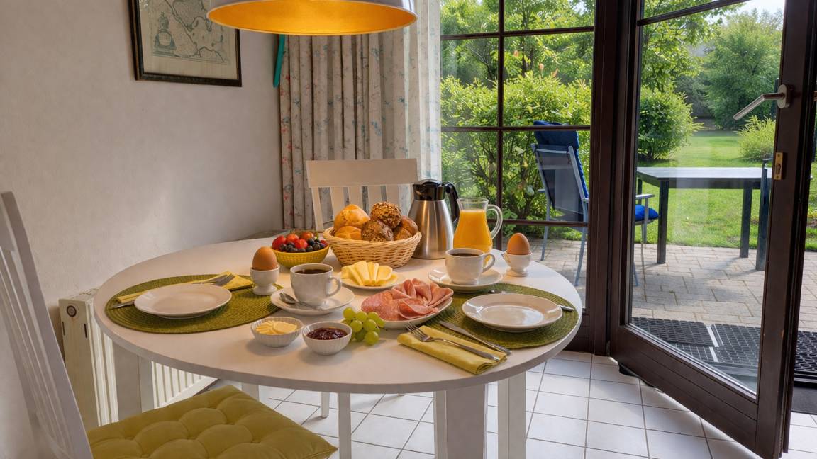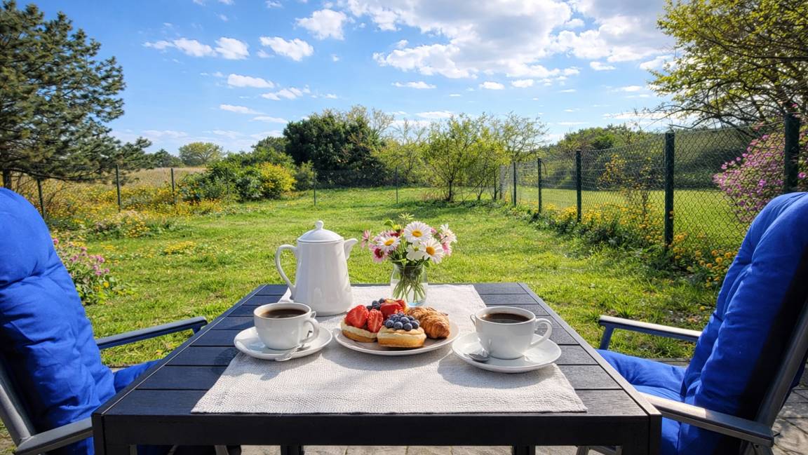 Ihr ca. 50 qm großes freistehendes reetgedecktes Bauernhaus 8RB1 (Nichtraucher) mit typisch niedrigen Raumhöhen ist im Maisonettenstil über 2 Etagen erbaut und mit einer offenen Treppe verbunden. Vor dem Wohnbereich im Erdgeschoss befindet sich eine schöne Südterrasse mit grünem Ausblick auf den eigenen Gartenteil. Im gemütlichen Wohnbereich mit einer Sitzgruppe und einem großem Flatscreen-TV finden Sie neben der angrenzenden Wohnküche auch einen Essbereich. Im Küchenbereich erwartet Sie ein einen Backofen, Kühlschrank, eine Kaffeemaschine, Wasserkocher sowie weitere nützliche Küchenhelfer. Ebenfalls im Erdgeschoss befindet sich das Badezimmer mit Dusche, Waschtisch und WC. Im Obergeschoss finden Sie den Schlafbereich mit Doppelbett und Kleiderschrank. Auch ein Kinderreisebett würde dort Platz finden. Durch den umzäunten eigenen Garten und die grüne Umgebung ist diese Wohnung perfekt für Kinder und Haustiere geeignet.