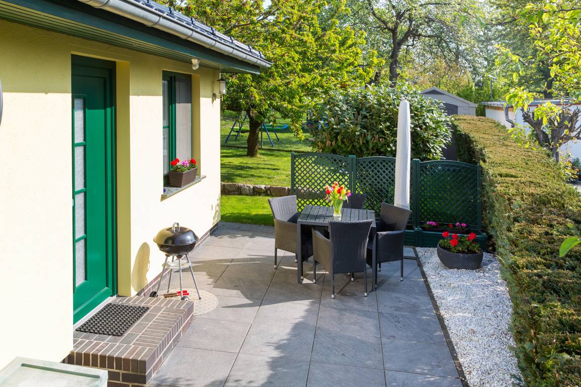 Zum Haus gehört eine Terrasse mit Gartenmöbeln, Spielplatz mit Trampolin, Sonnenschirm und Grill.