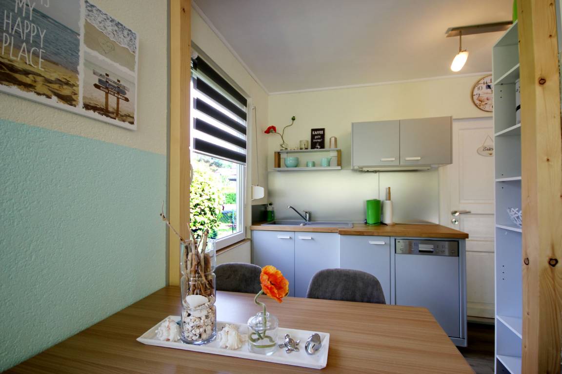 Der Bungalow teilt sich auf in ein Wohnzimmer mit Kamin, einem Essbereich, einer separaten Küche, ein Tageslichtbad sowie zwei Schlafzimmer. Eine angrenzende Terrasse mit Strandkorb und Blick ins Grüne lädt zum Verweilen und Sonnenbaden ein. Im gemütlichen Wohnraum erwartet Sie eine bequeme Sitzecke sowie ein separater Essbereich, ein Kamin und ein Flachbild-TV. Die integrierte Küche verfügt über ein 2-Platten-Kochfeld, einen Kühlschrank mit kleinem Gefrierfach, Geschirrspüler, Kaffeemaschine, Toaster, Mikrowelle und Wasserkocher. Im Tageslichtbad finden Sie eine Dusche, Waschtisch sowie WC. Das Hauptschlafzimmer ist mit einem Doppelbett und einem Kleiderschrank ausgestattet. Das zweite Schlafzimmer verfügt über ein Etagenbett für 2 Personen. Durch den eigenen abschließbaren Garten und die grüne Umgebung ist diese Wohnung ideal für Familien mit Kindern und Haustieren geeignet. Ihren PKW können Sie direkt am Haus abstellen. Hier haben bis zu 2 PKW's Platz. Fahrräder können Sie im hauseigenen Raum unterstellen. Die unbefestigte Zufahrtsstraße ist für Autos mit geringer Bodenfreiheit nicht geeignet.