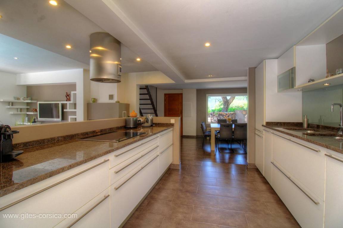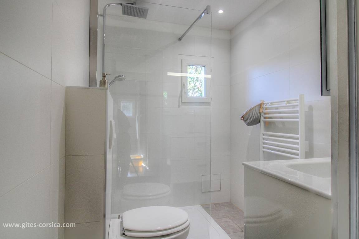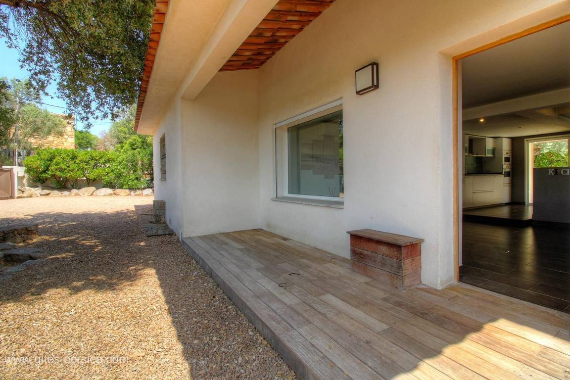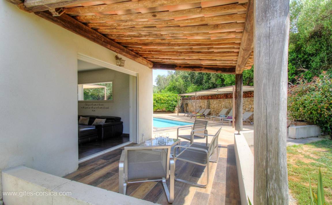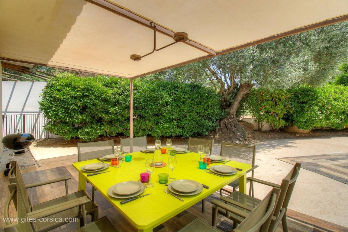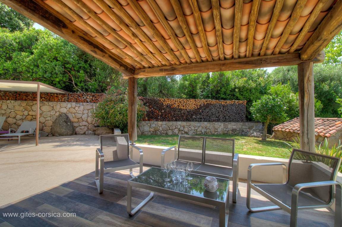 - Terrasse von 145 m², davon 1 Terrassenecke von 18m², die von einer Pergola für den Essbereich überdacht ist, und 1 weitere Terrassenecke von 10m², die von einer Überdachung mit Ziegeldach überdacht ist und mit einer Lounge ausgestattet ist.