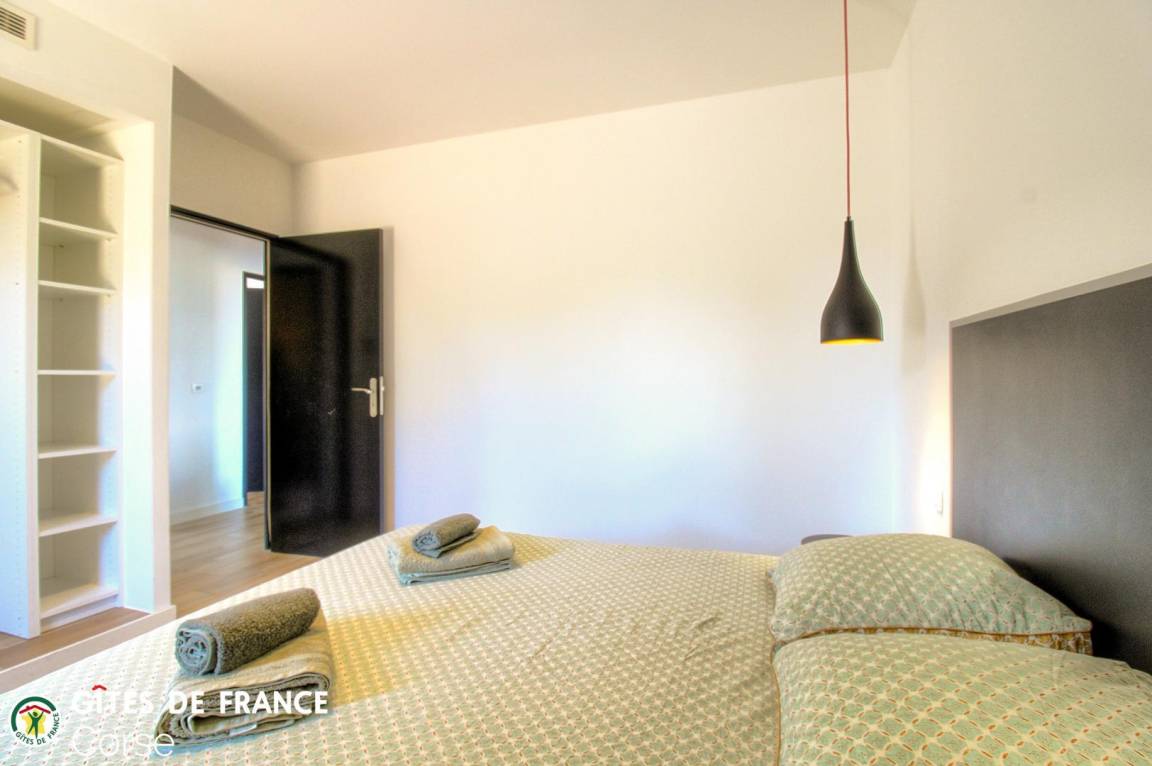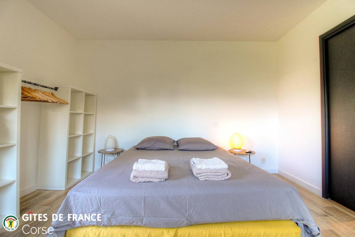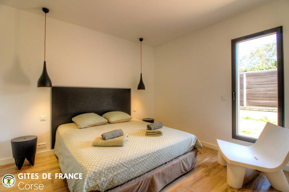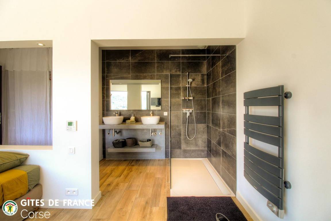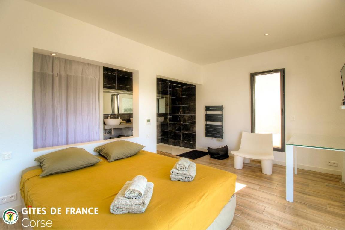 - 1 Schlafzimmer mit 1 Bett 160x200 cm mit offenem Badezimmer und WC, das durch eine Schiebetür verschlossen ist.