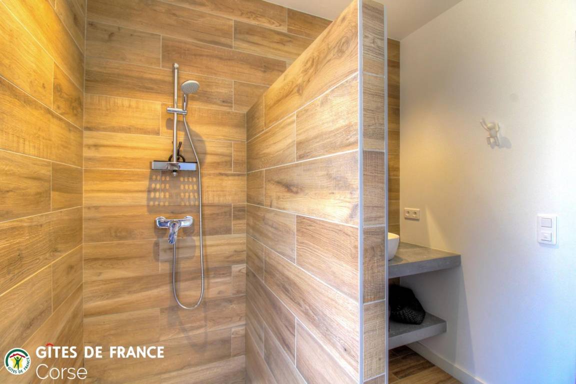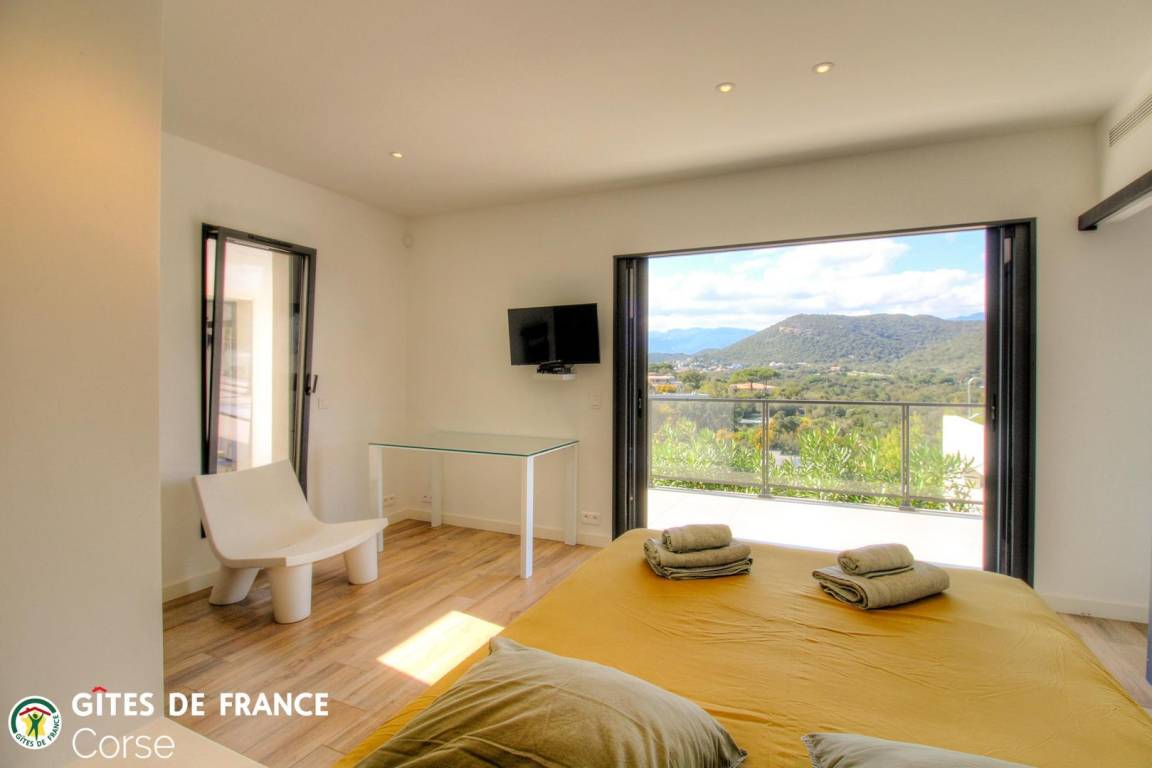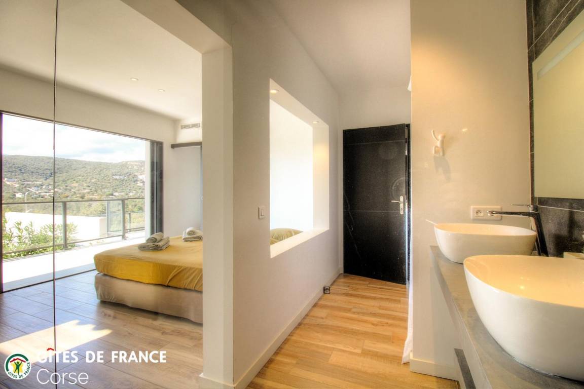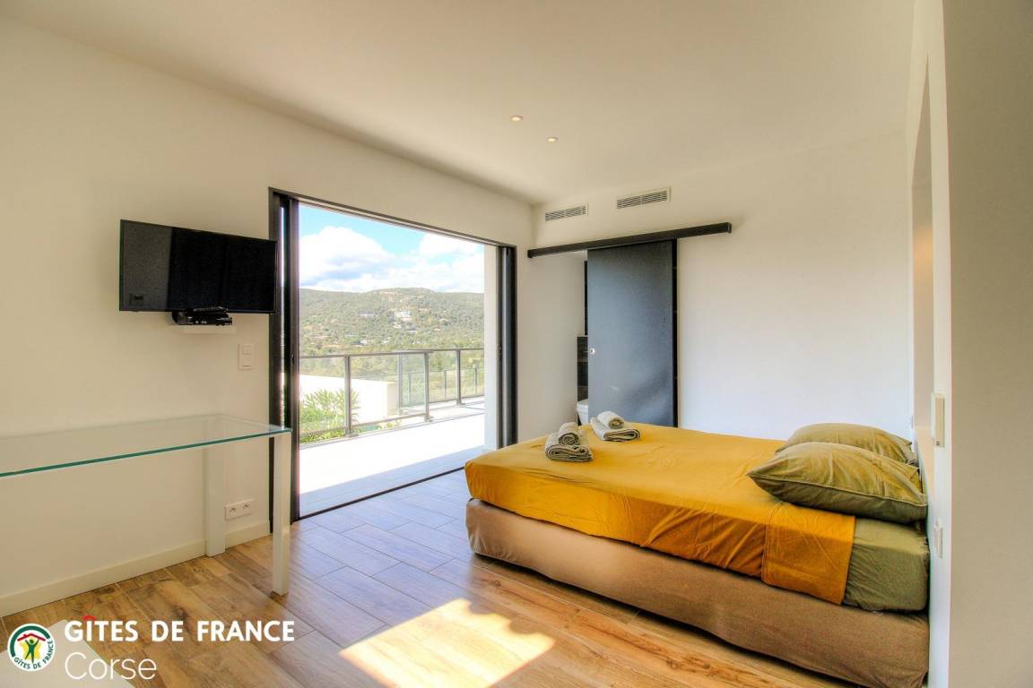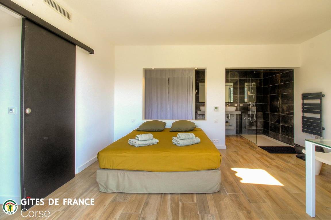 - 1 Schlafzimmer mit 1 Bett 160x200 cm mit offenem Badezimmer und WC, das durch eine Schiebetür verschlossen ist.