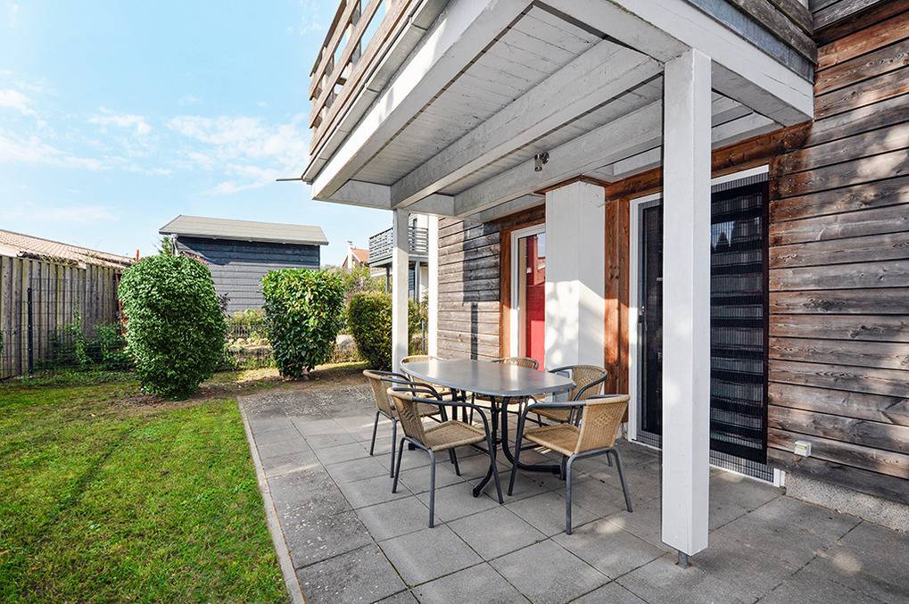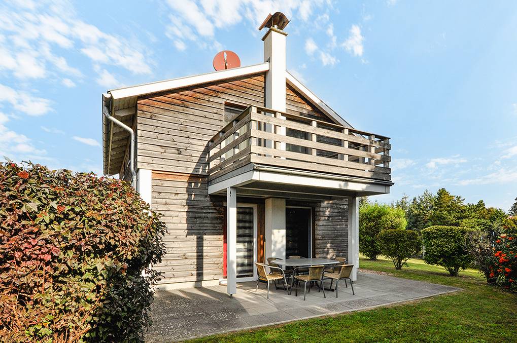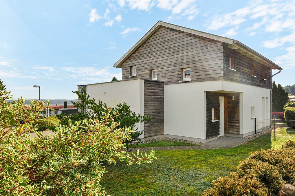 D 45.91 Ferienhaus 1-6 Pers.: Schönes 3-Zimmerhaus mit 95 qm Wohnfläche über 2 Etagen. Parterre: Flur mit Garderobe. Wohn-/Essraum mit Sitzgruppe (Schlafsofa 1-2 Pers.), Kaminofen, Smart-TV, Esstisch, gut ausgestatteter Einbauküche (Backofen, Spülmaschine), teilüberdachte Terrasse. Bad: Du, Wb, WC, Sauna. 1. Etage (leichte Schrägen): Doppelzimmer mit TV, Balkon (Seeblick). Doppelzimmer mit Balkon (Seeblick). Bad: Du, Wb, WC.