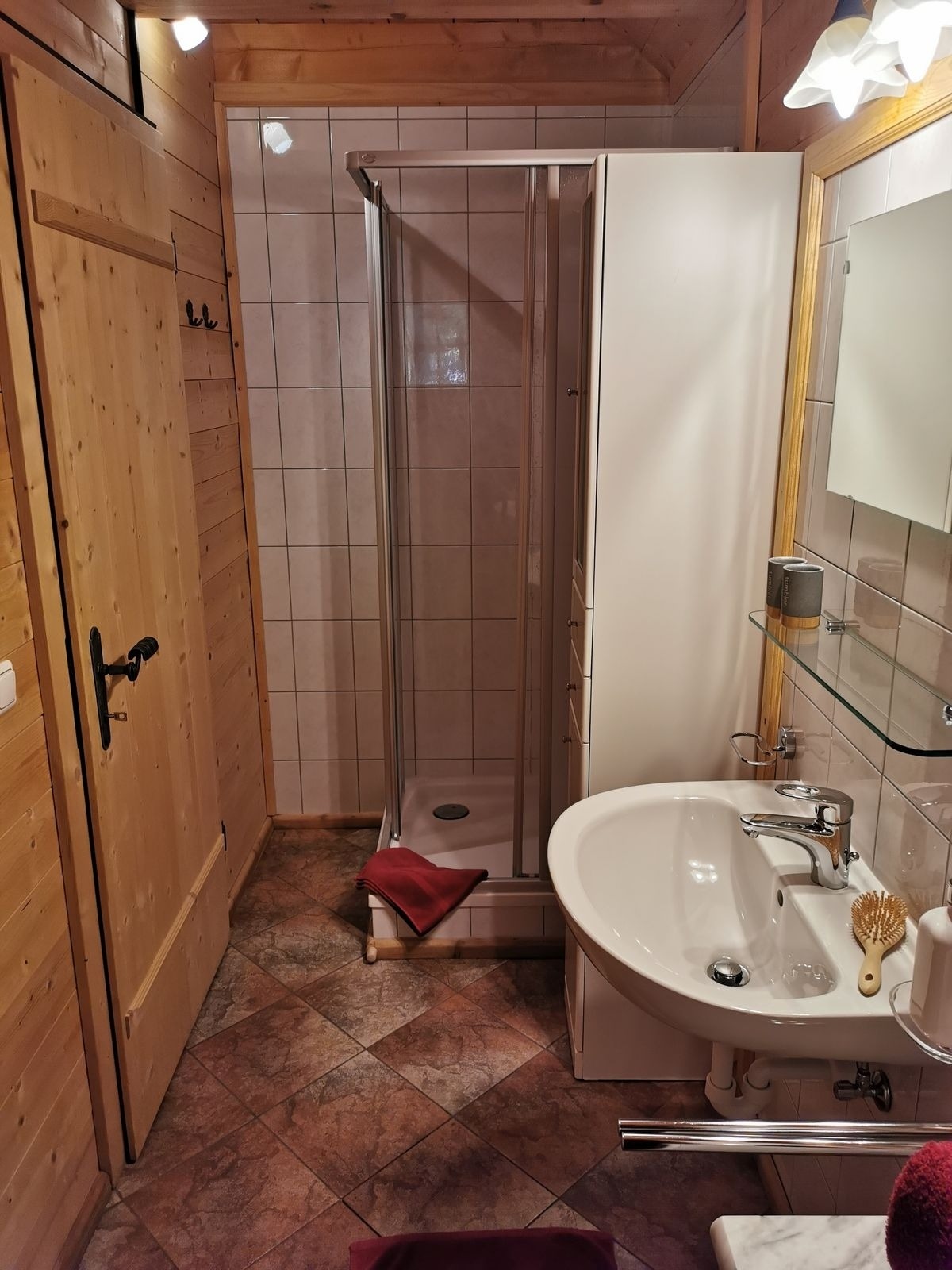 1 Badezimmer mit Dusche, Waschbecken und WC