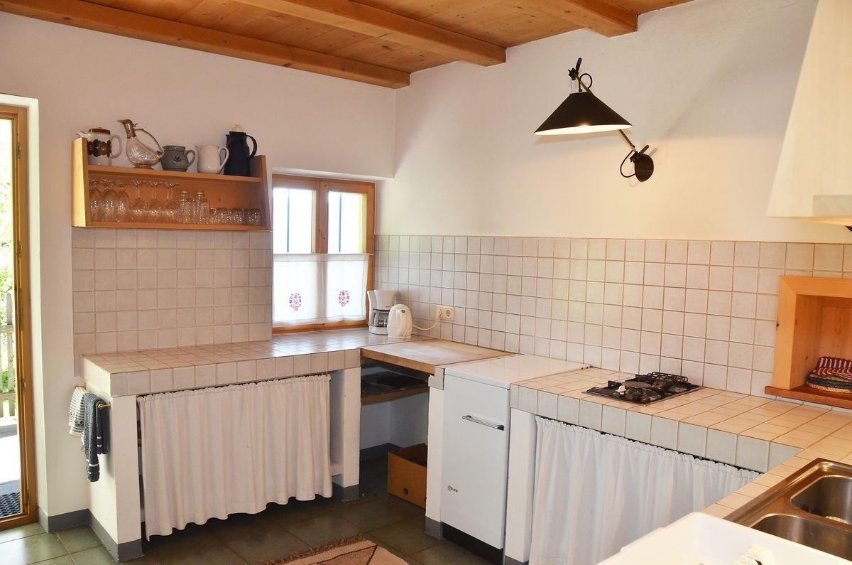 Küche mit Elektroherd, Backofen, Gasherd, Holzherd, Kühlschrank mit Gefrierfach, Kaffeemaschine, Wasserkocher und Fonduegeschirr