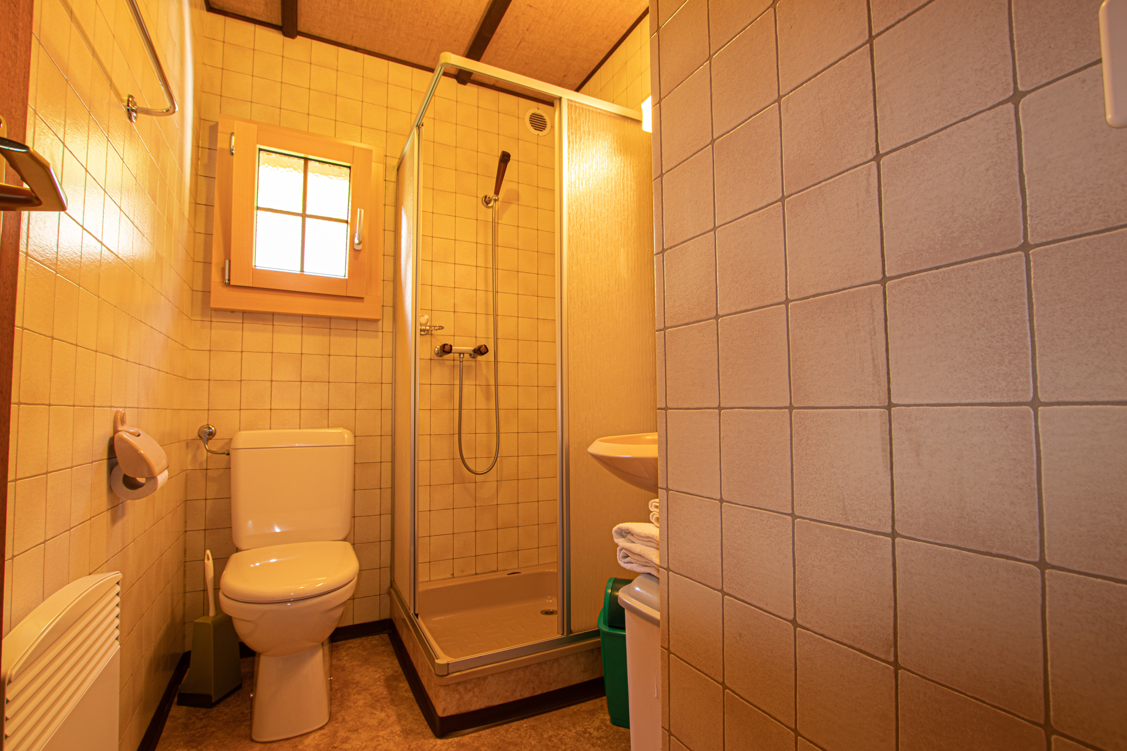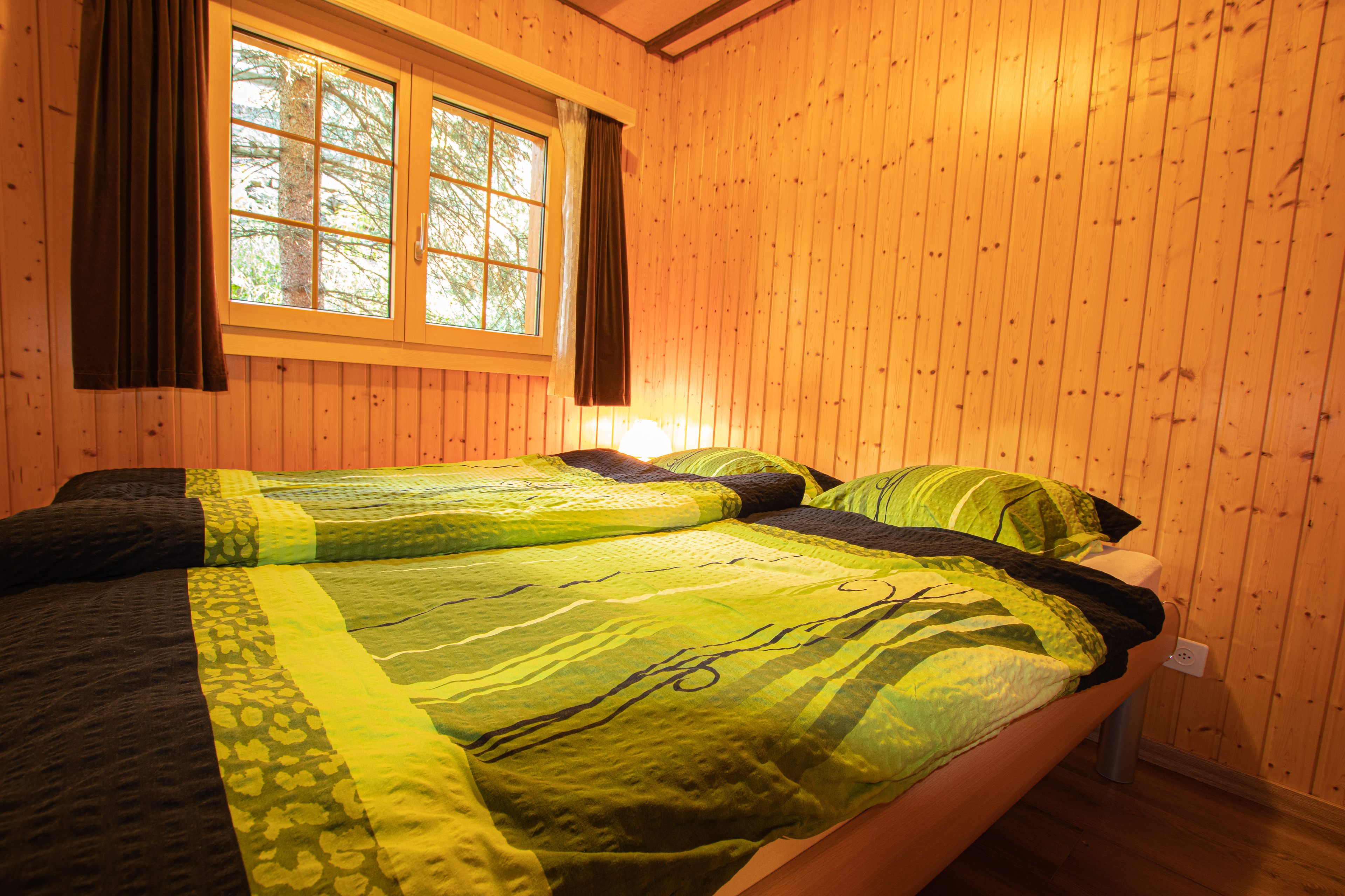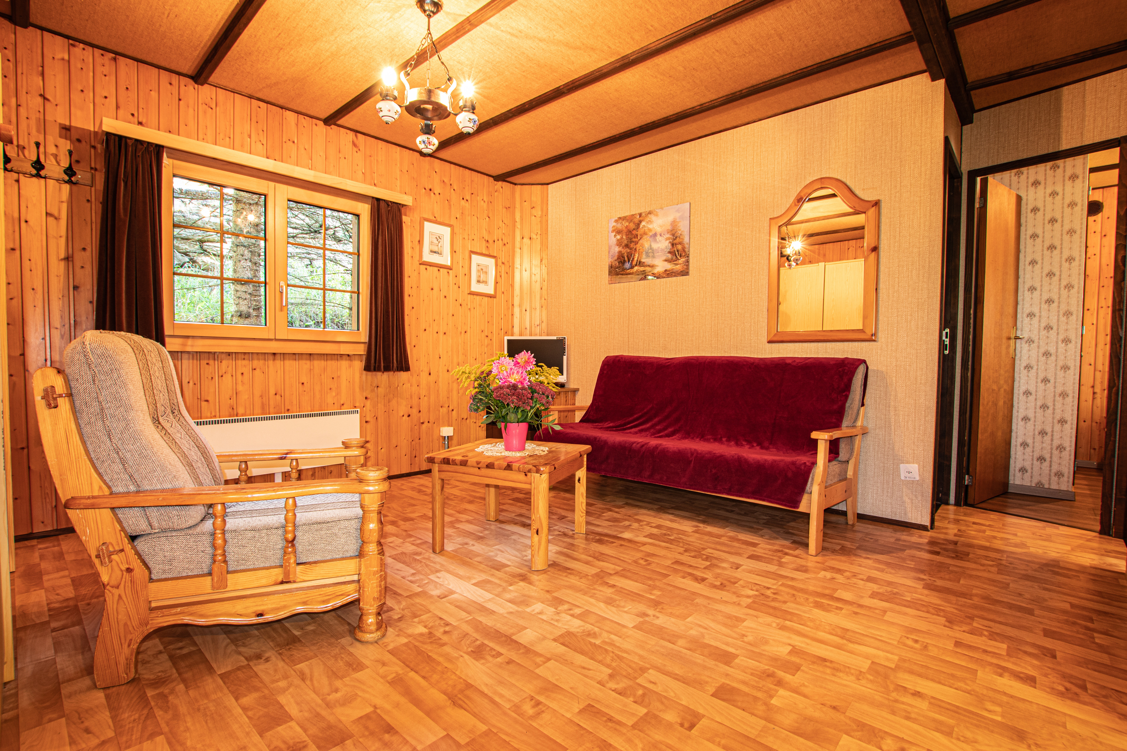 3-Zimmer-Chalet, Erdgeschoß, ca. 45 m². Überdachter Eingangsbereich in Wohn-/Schlafraum mit 2 Schrankbetten, Eßecke (Eckbank und 3 Stühle) sowie einer Küchenzeile mit Einbauherd (3 Platten, Backofen), Kühlschrank, Kaffeemaschine und Wasserkocher. 2 Zweibettzimmer. Dusche/WC.