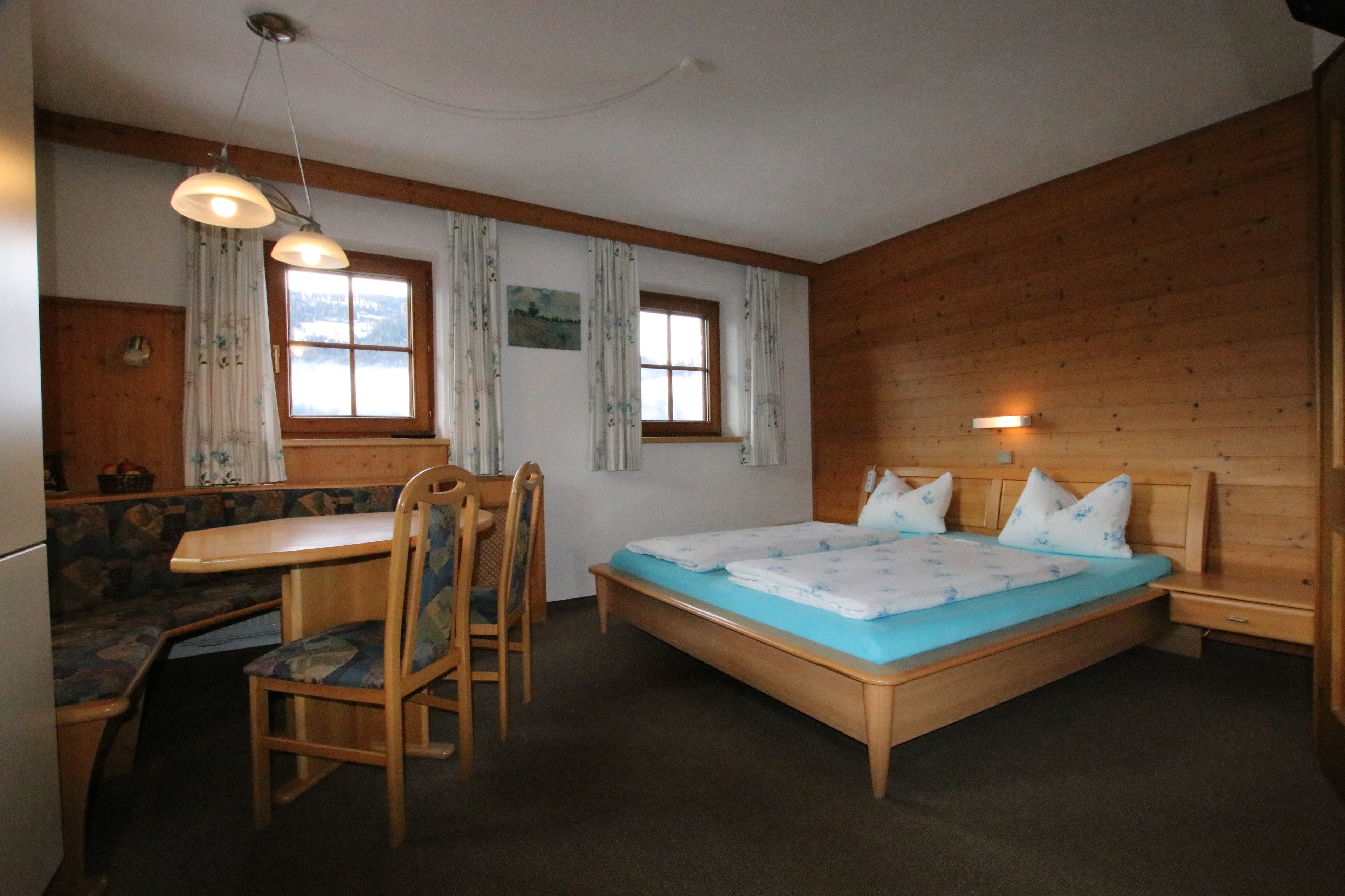 4-Zimmer-Wohnung, in der 1. Etage, mit ca. 70 m² Wohnfläche. Wohnküche (Backofen und Herd mit 4 Ceranfeldern, zusätzlicher Holzherd, Kühlschrank, Kaffeemaschine und Wasserkocher, ein Essplatz mit Eckbank. Balkon mit Panoramablick. Dusche/WC. Schlafzimmer mit Doppelbett, und direktem Zugang zu einem weiterem Doppelzimmer, (Einzelbett als Zusatzbett). Neben der Wohnung befindet sich ein weiteres Doppelzimmer mit Dusche/WC.