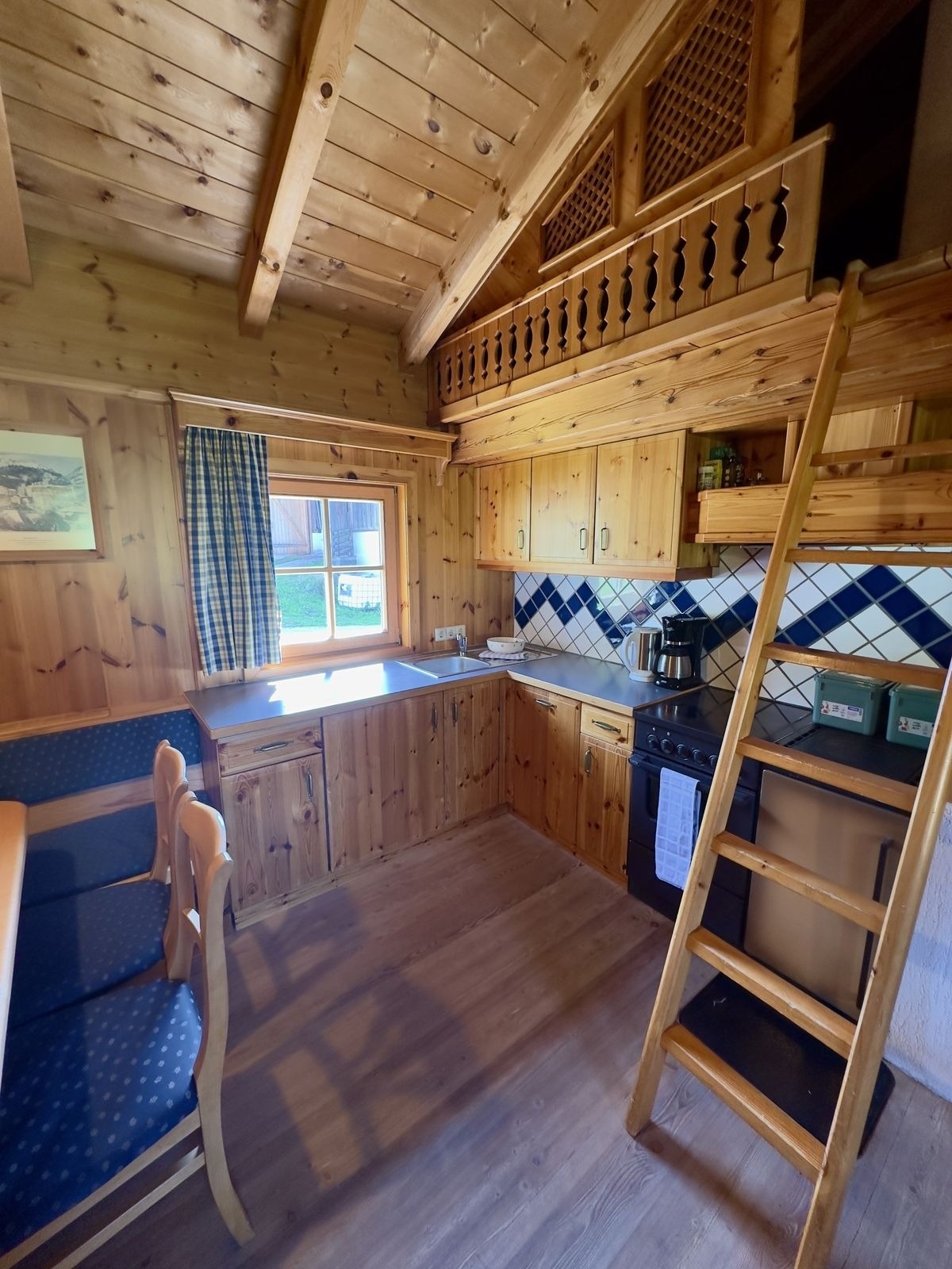 Erhöhter Schlafraum für 2 Personen im Wohnbereich (über eine Leiter erreichbar)